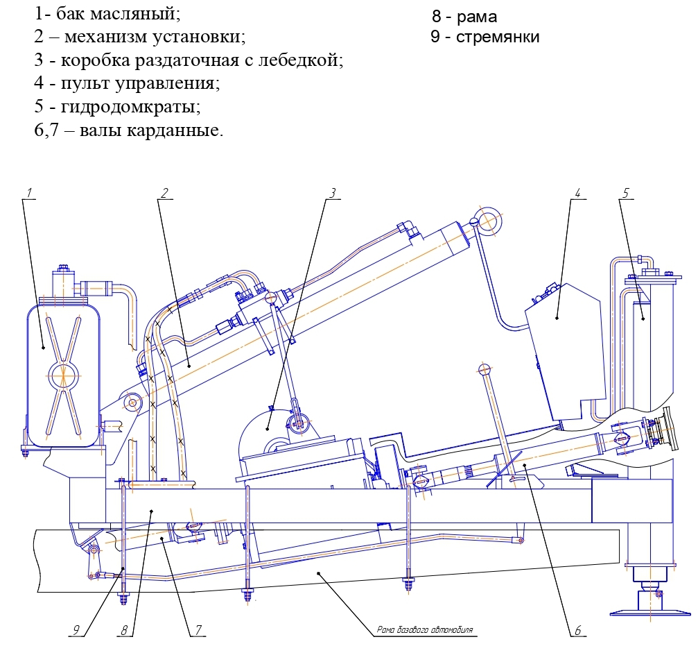 На раме устанавливаются: бак масляный; механизм установки; коробка раздаточная с лебедкой; пульт управления; гидродомкраты; валы карданные.
